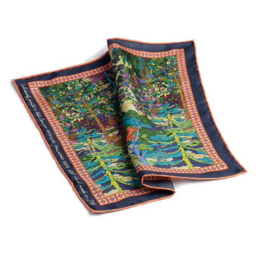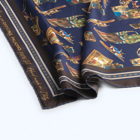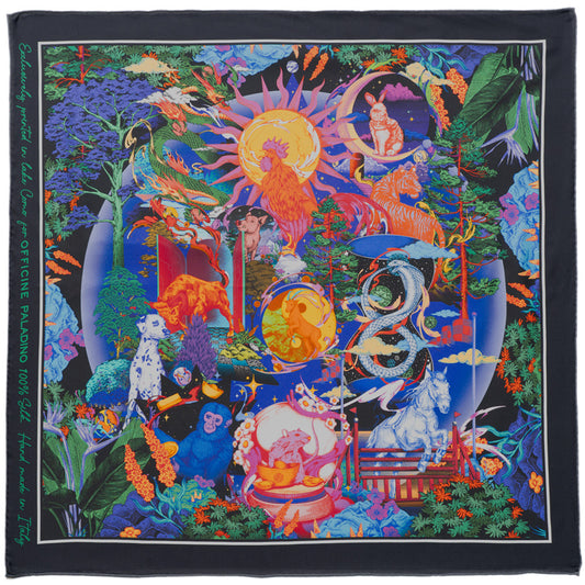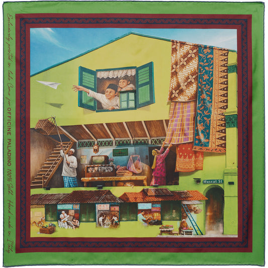 In our Quadro collection of silk accessories, we have re-imagined our prints as playful, sophisticated highlights that complement your outfit. These designs, such as Yip Yew Cheng’s graffiti work on an Arab Street shophouse in Singapore, or Pomme Chan’s trompe l’oeil and tone-on-tone prints, hold special meaning to the Officine Paladino family. Use them as a twilly, a neckerchief, or to match your next suit.